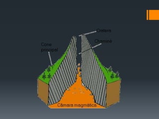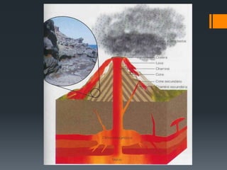 O documento descreve o que são vulcões e erupções vulcânicas, incluindo os tipos de erupções e exemplos de vulcões ativos em todo o mundo. Vulcões surgem devido ao movimento de placas tectônicas e emitem lava, gases e cinzas durante as erupções, que podem causar danos, mas também melhorar a fertilidade dos solos. A atividade vulcânica pode ser monitorada para prever erupções e minimizar riscos.