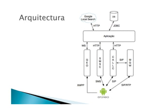 O documento descreve um sistema de publicidade baseado em contexto que usa a localização do usuário para fornecer anúncios relevantes através de uma interface web ou SMS. Ele registra a localização dos clientes usando um daemon Android e serviços de geolocalização como o Google Local Search.