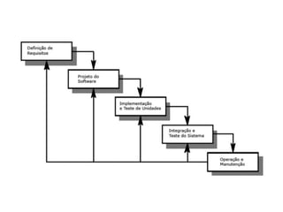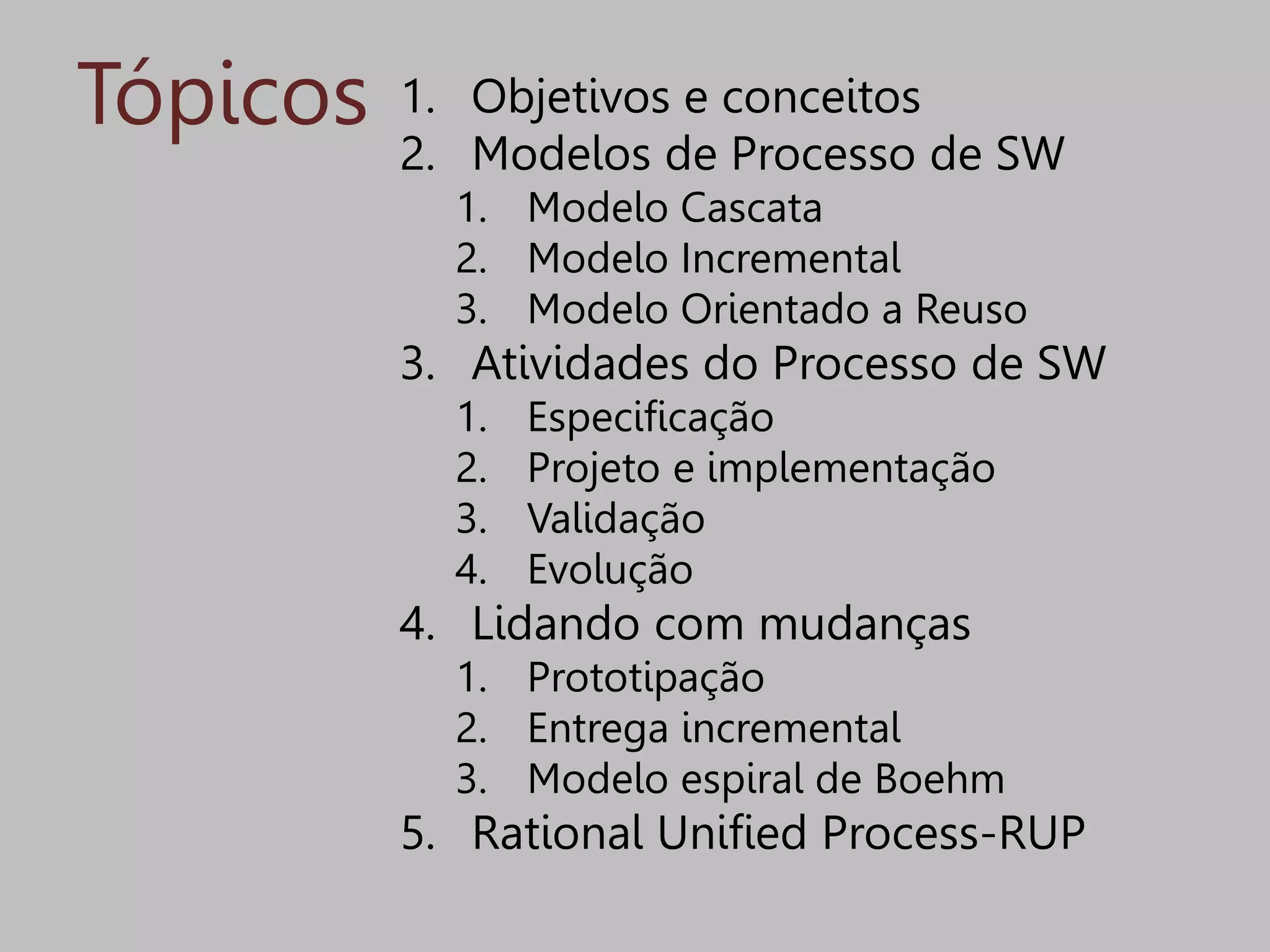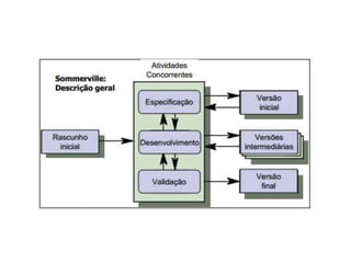 O documento discute processos de engenharia de software, incluindo modelos de processo como cascata, incremental e orientado a reuso. Ele também descreve atividades-chave como especificação, projeto, implementação, validação e evolução. Além disso, aborda técnicas para lidar com mudanças como prototipação, entrega incremental e o modelo espiral de Boehm, bem como o Rational Unified Process.