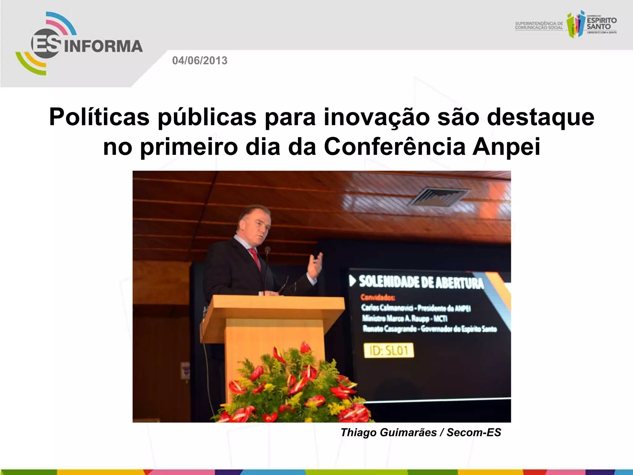O documento resume 12 notícias de vários órgãos do governo do Espírito Santo publicadas em 04/06/2013, incluindo sobre inovação, meio ambiente, esportes, segurança pública, economia e saúde.