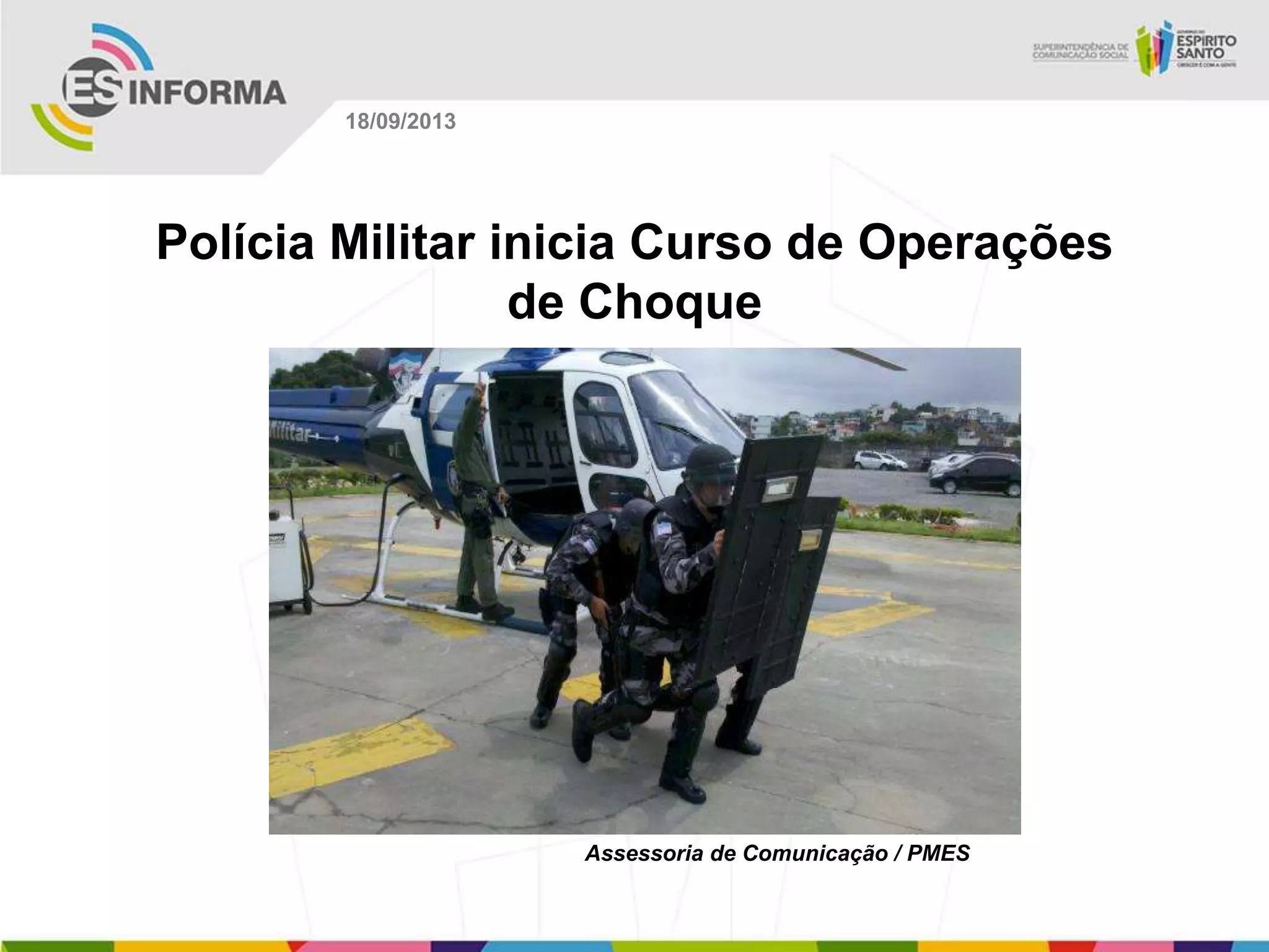 O documento resume 12 notícias de assessorias de comunicação de diferentes órgãos do governo do Espírito Santo, incluindo a Polícia Militar, Secretaria de Educação, Secretaria de Turismo, Secretaria de Desenvolvimento Urbano e Meio Ambiente, sobre eventos como o início de um curso de operações de choque, programa de financiamentos em Ibiraçu, debate sobre o Parque Nacional do Caparaó, palestra sobre agrotóxicos em Nova Venécia e inauguração de uma escola em Linhares.