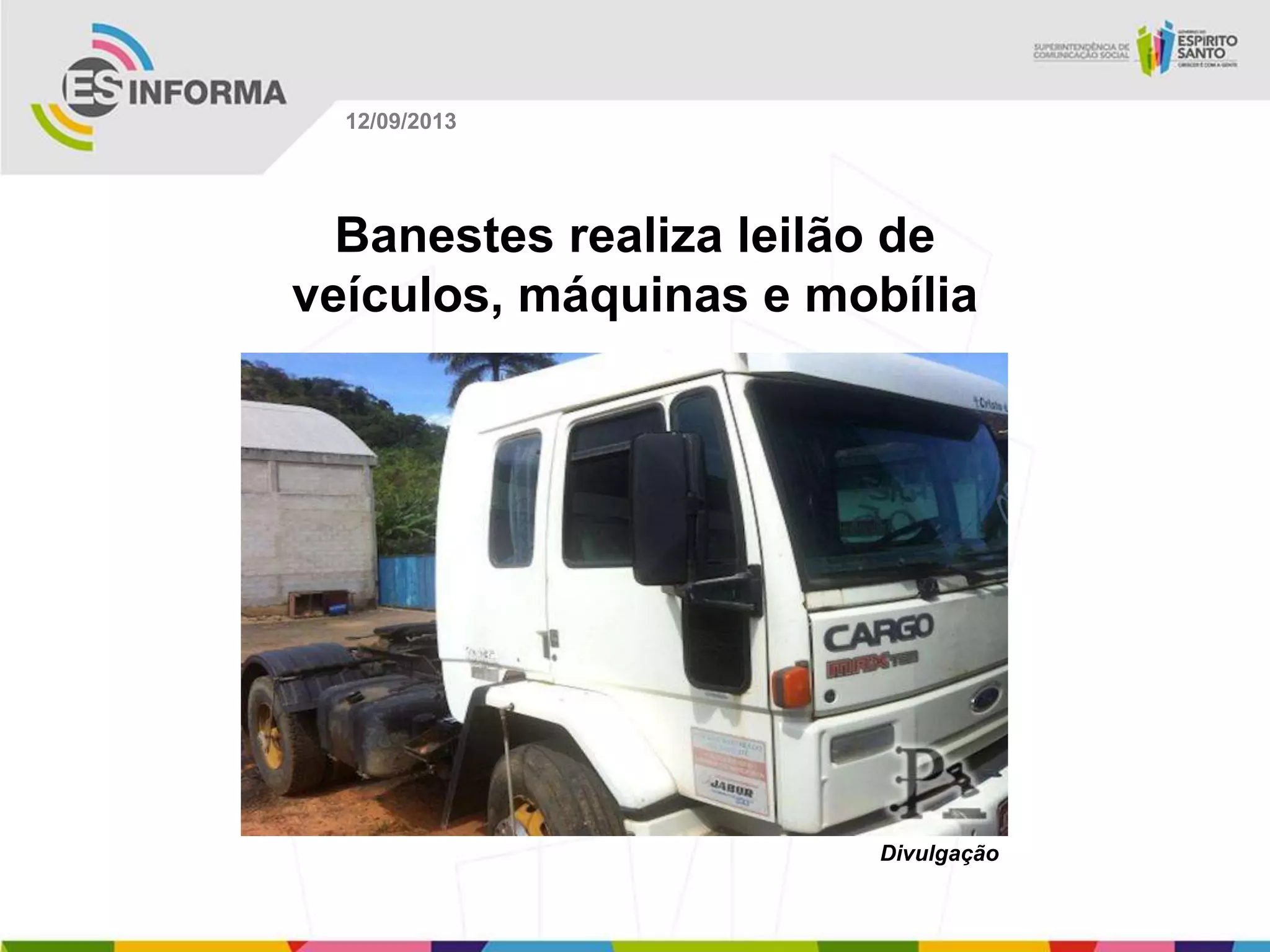 Este documento resume várias notícias de agências de comunicação do estado do Espírito Santo em 12 de setembro de 2013. Inclui informações sobre um leilão de veículos realizado pelo Banestes, um incremento de verba para compra de remédios pela Sesa, o término do ES Restaurant Week, uma apresentação musical no Parque Moscoso, um projeto do Proerd na PMES, orientações sobre direção em períodos chuvosos pelo Detran, previsões sobre a safra de café menor neste ano, um concerto internacional assistido por alun