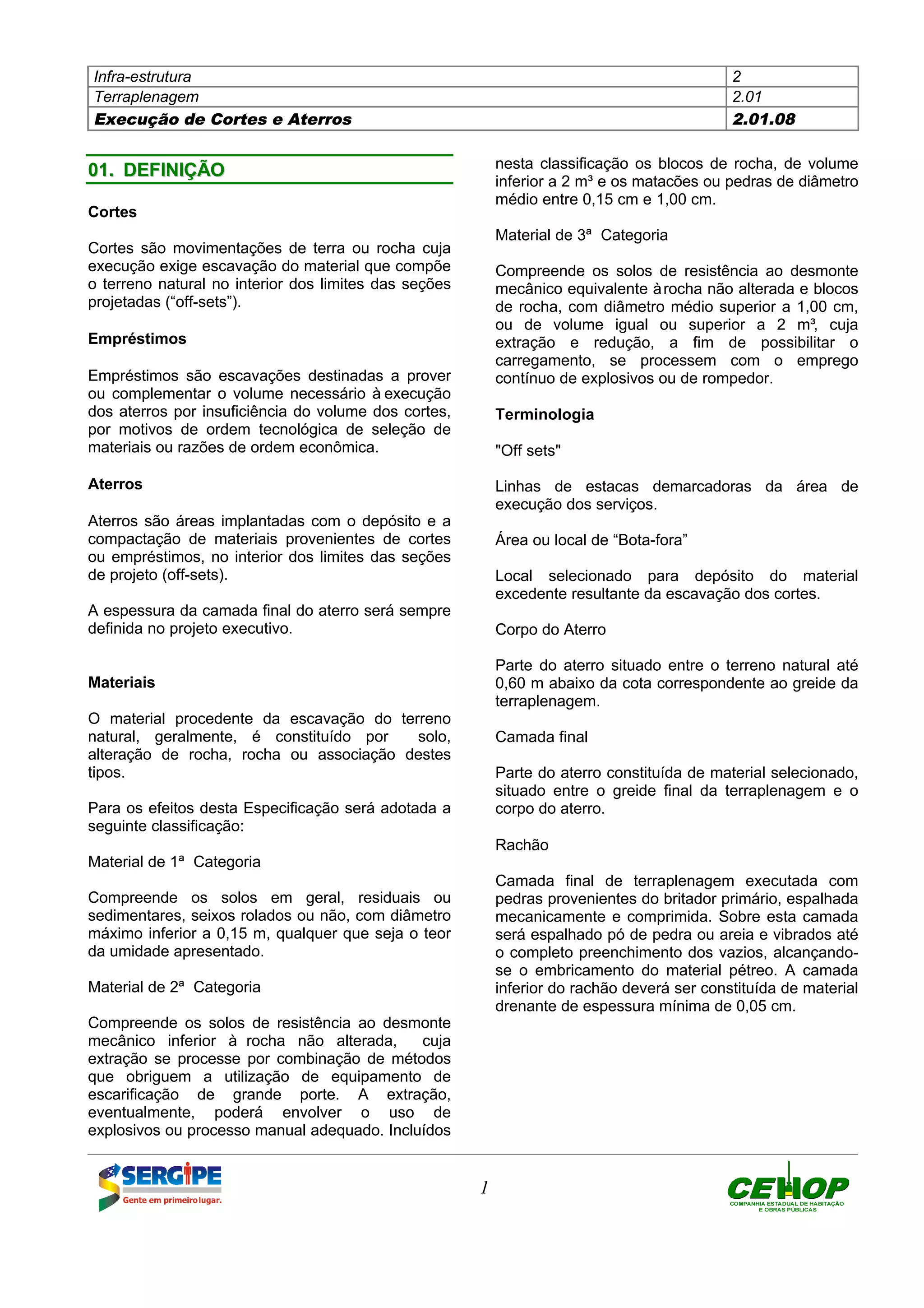 O documento define termos técnicos relacionados à execução de cortes e aterros para obras de infraestrutura de terraplenagem. Descreve cortes como escavações que removem material do terreno natural, aterros como áreas onde esse material é depositado e compactado, e empréstimos como escavações para obter material adicional para aterros. Detalha também os métodos, equipamentos e critérios para realizar cortes, aterros e empréstimos de acordo com as especificações do projeto.