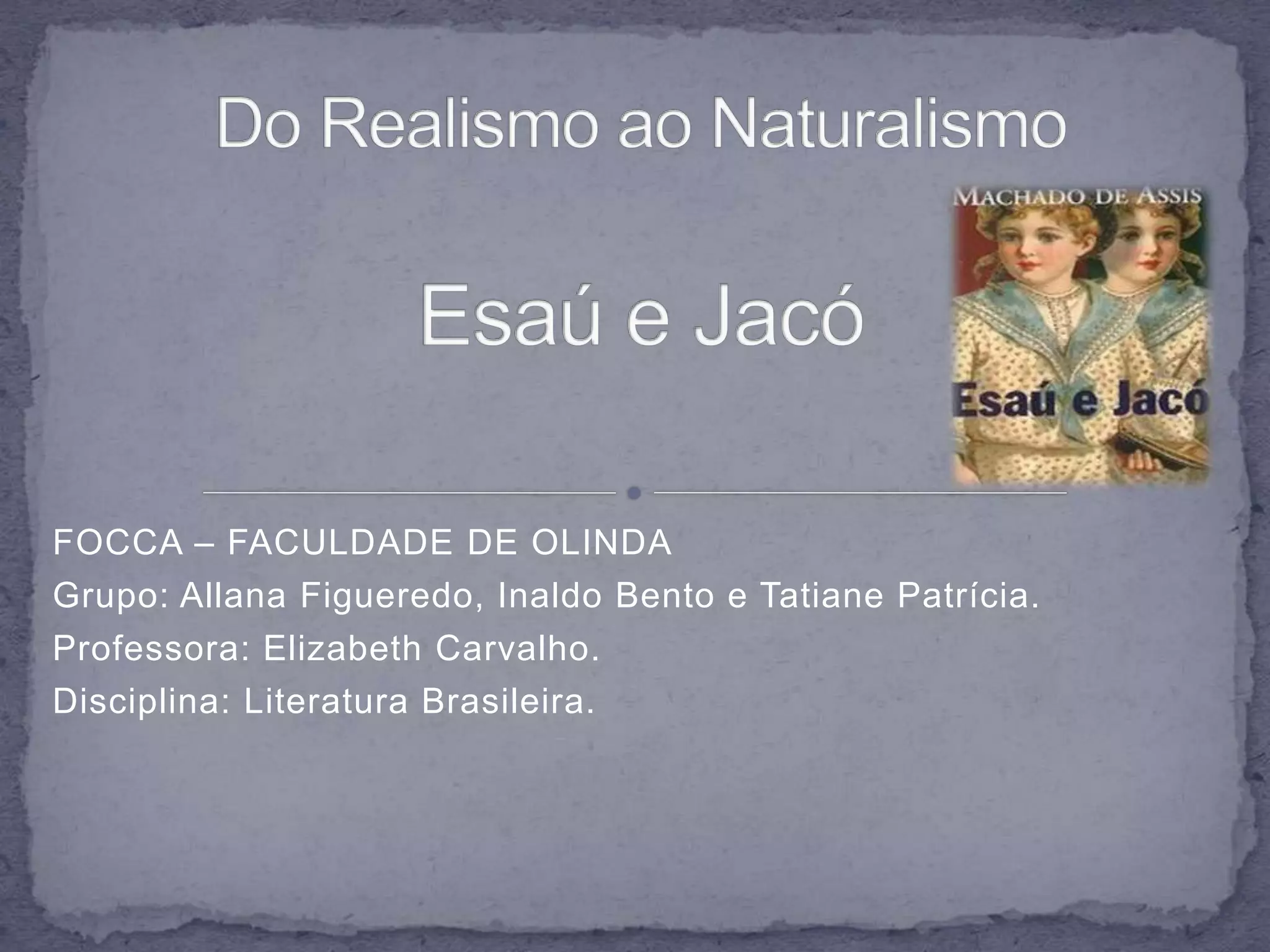 O conto "Esaú e Jacó" de Machado de Assis publicado em 1904 usa alegorias para discutir de forma sutil a política brasileira da época, embora o autor fosse visto como apolítico. A obra sugere segredos sobre a alma humana mais do que declará-los diretamente e faz o leitor refletir sobre a posição política do escritor.