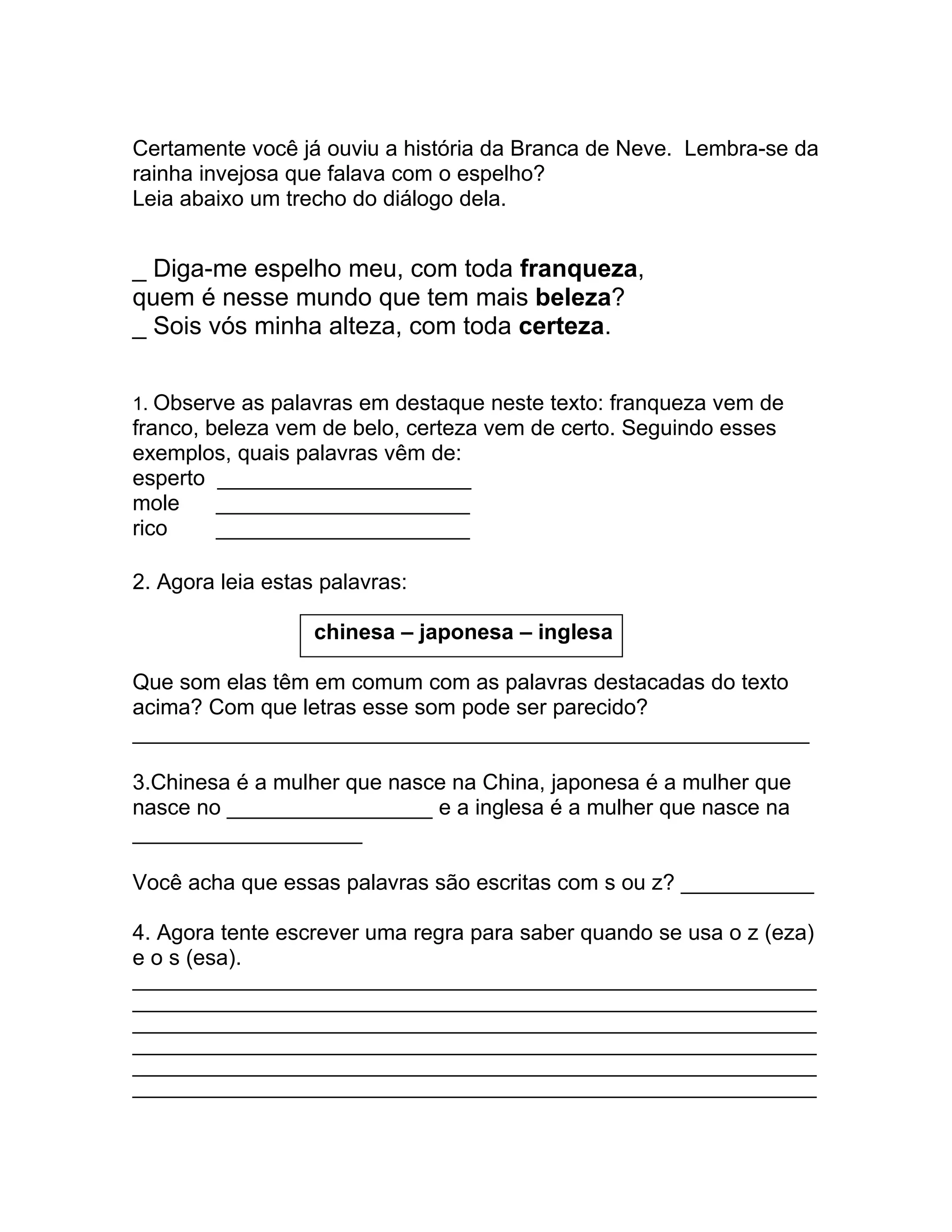 O documento descreve um trecho da história da Branca de Neve onde a rainha pergunta ao espelho quem é a mais bela. Ele então pergunta sobre palavras relacionadas a franqueza, beleza e certeza e sobre como escrever palavras que terminam em -esa ou -eza.