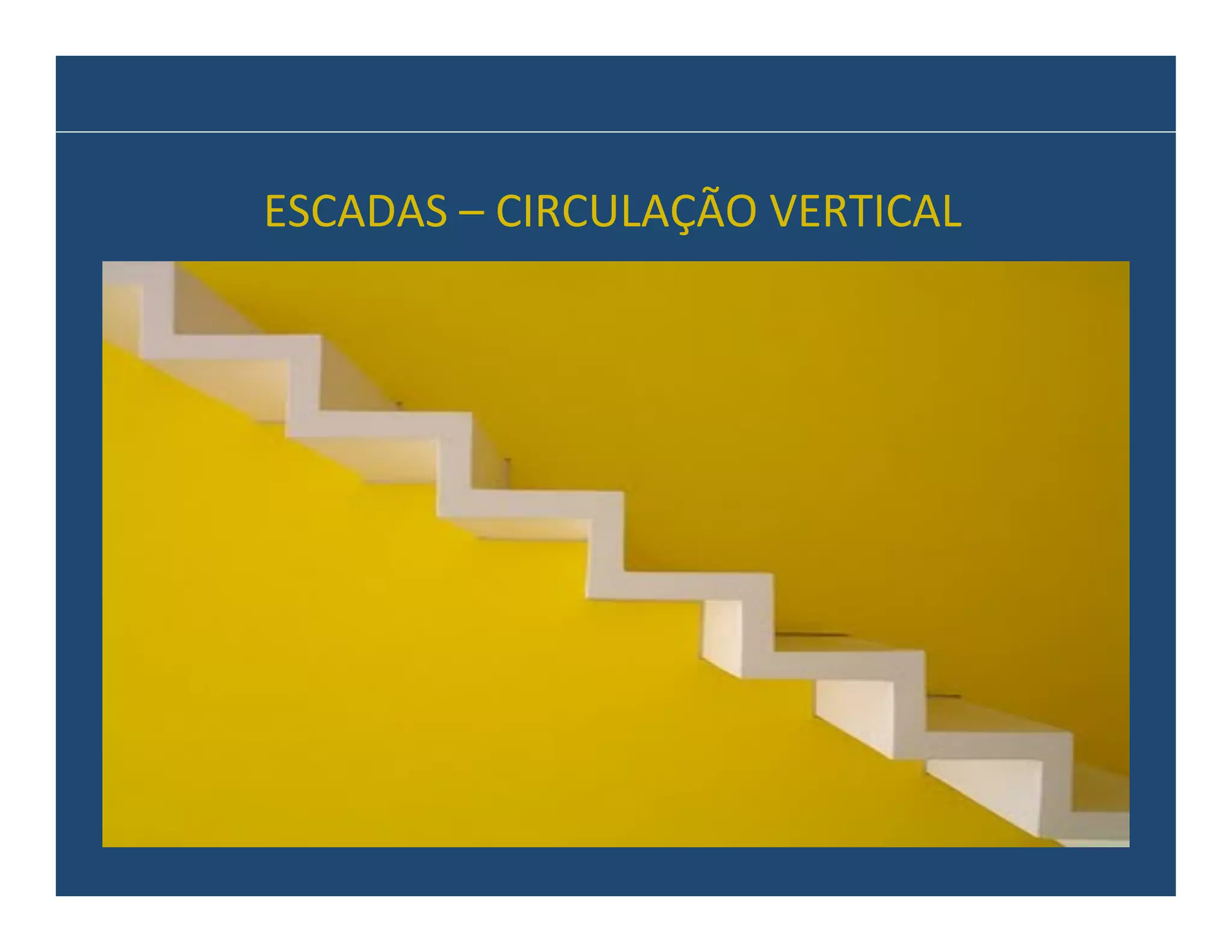 O documento descreve os principais elementos e métodos de projeto de escadas. Escadas são a forma mais comum de circulação vertical, sendo mais compactas que rampas e mais baratas que elevadores. Devem ser projetadas de modo a propiciar conforto e segurança aos usuários.