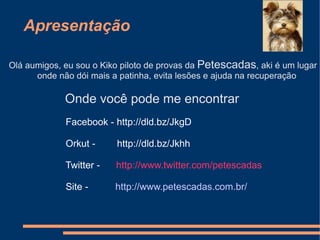O documento descreve os benefícios de escadas e rampas para animais de estimação, como prevenir lesões e melhorar a mobilidade de cães e gatos de diferentes idades e condições. É apresentado o site e as redes sociais da PetEscadas, que fabrica essas estruturas para ajudar os bichinhos.