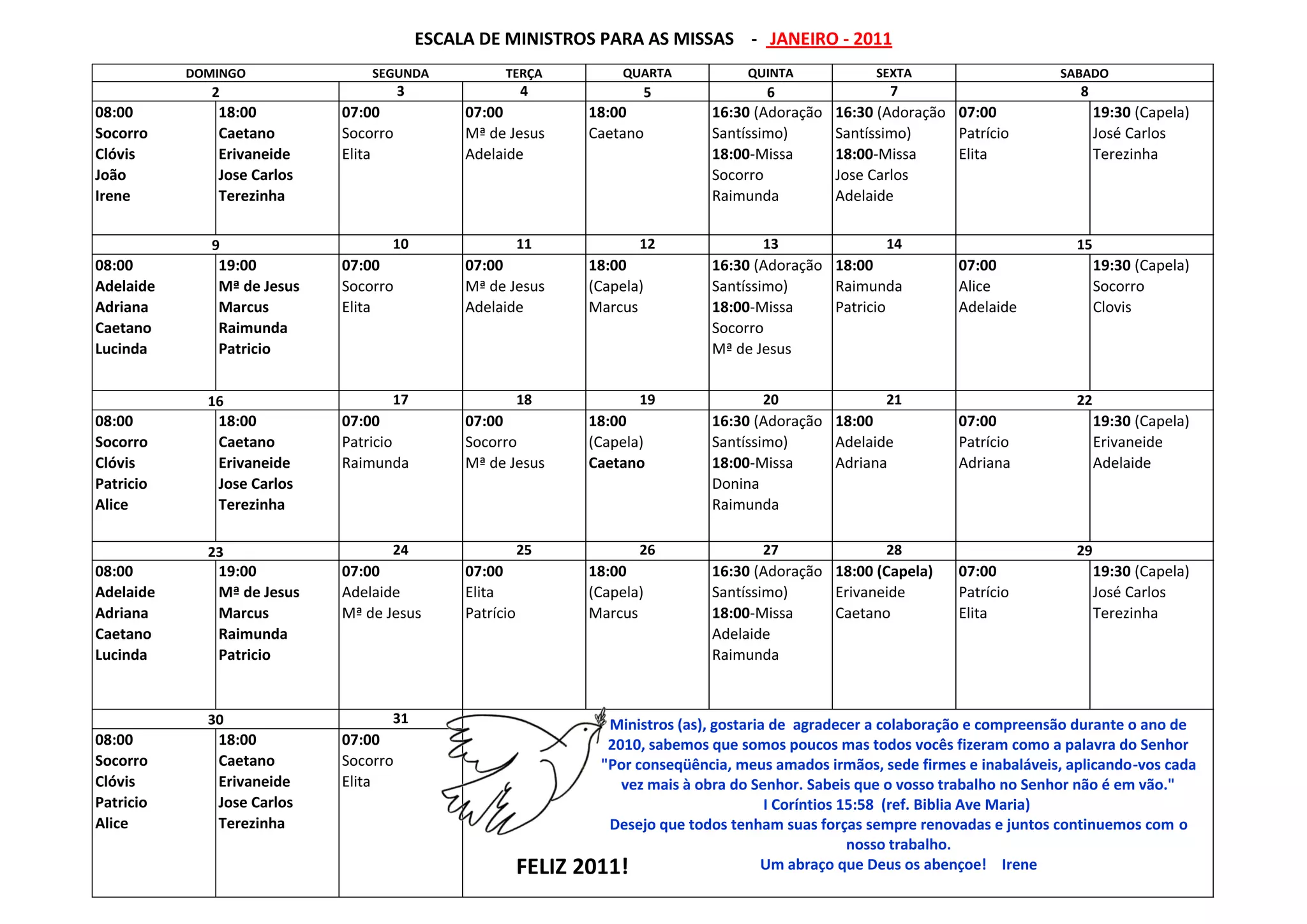 O documento lista o cronograma de ministros para as missas do mês de janeiro de 2011, com os nomes dos ministros para cada dia da semana, horário e local da missa. Agradece a colaboração dos ministros no ano de 2010 e deseja um feliz ano novo, citando uma passagem bíblica sobre o trabalho não ser em vão.