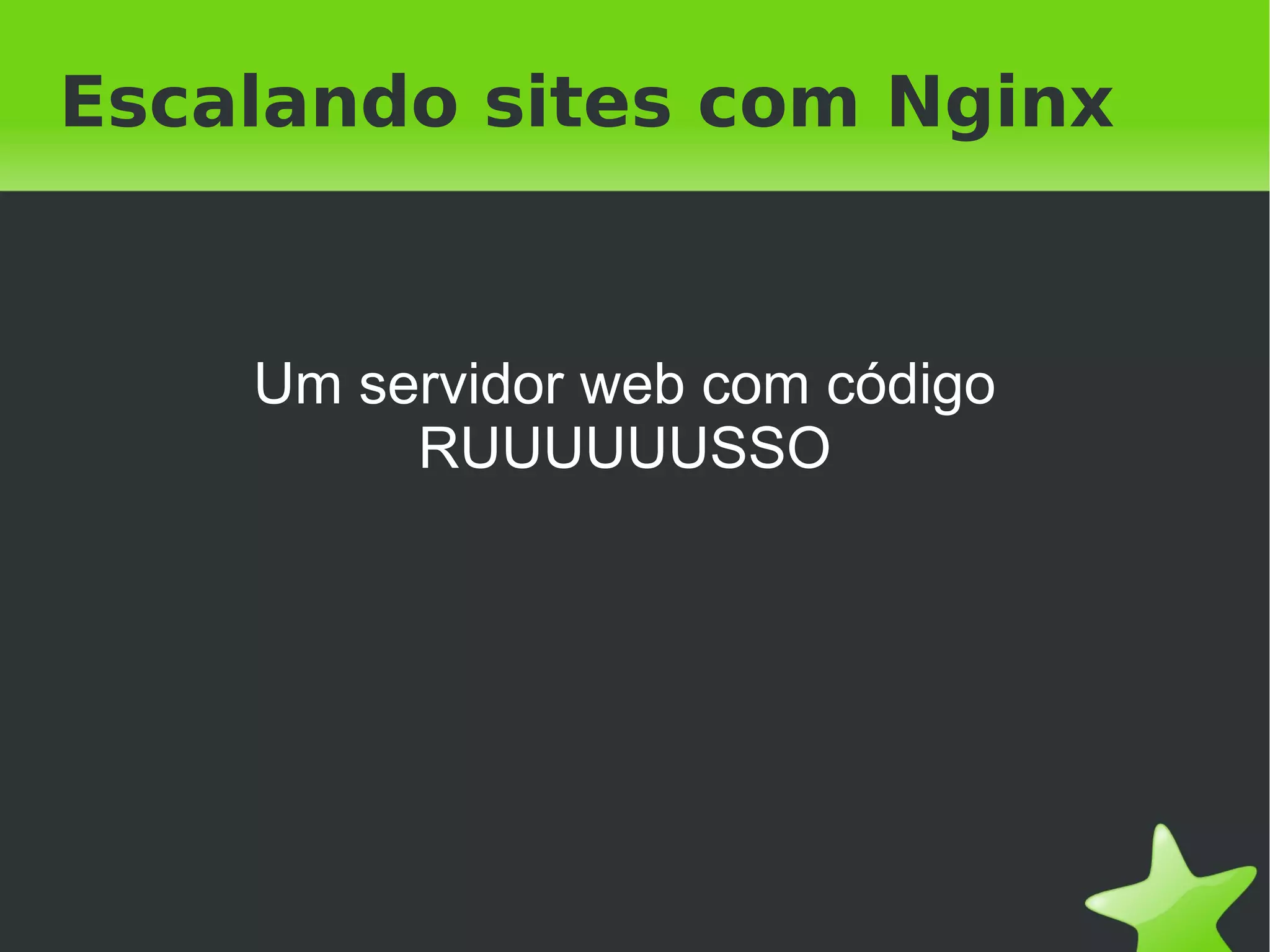 O documento aborda a escalabilidade de sites usando o Nginx como servidor web, destacando sua eficiência em lidar com conteúdos estáticos e dinâmicos. Também fornece configurações detalhadas para implementar cache de forma eficaz para melhorar o tempo de resposta e reduzir a sobrecarga no servidor. Conclui enfatizando a estabilidade, desempenho, escalabilidade e baixo custo do uso do Nginx.