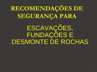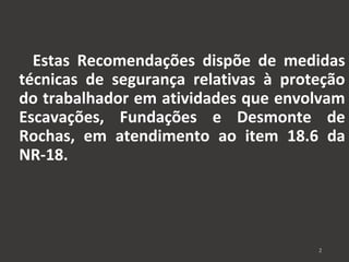 Este documento fornece recomendações de segurança para atividades de escavação, fundação e desmonte de rochas. Ele descreve riscos comuns e medidas preventivas como projetar taludes adequados, isolar a área de trabalho, usar sinalização, proteger edifícios vizinhos e redes de serviços, e fornecer equipamentos de proteção individual aos trabalhadores.