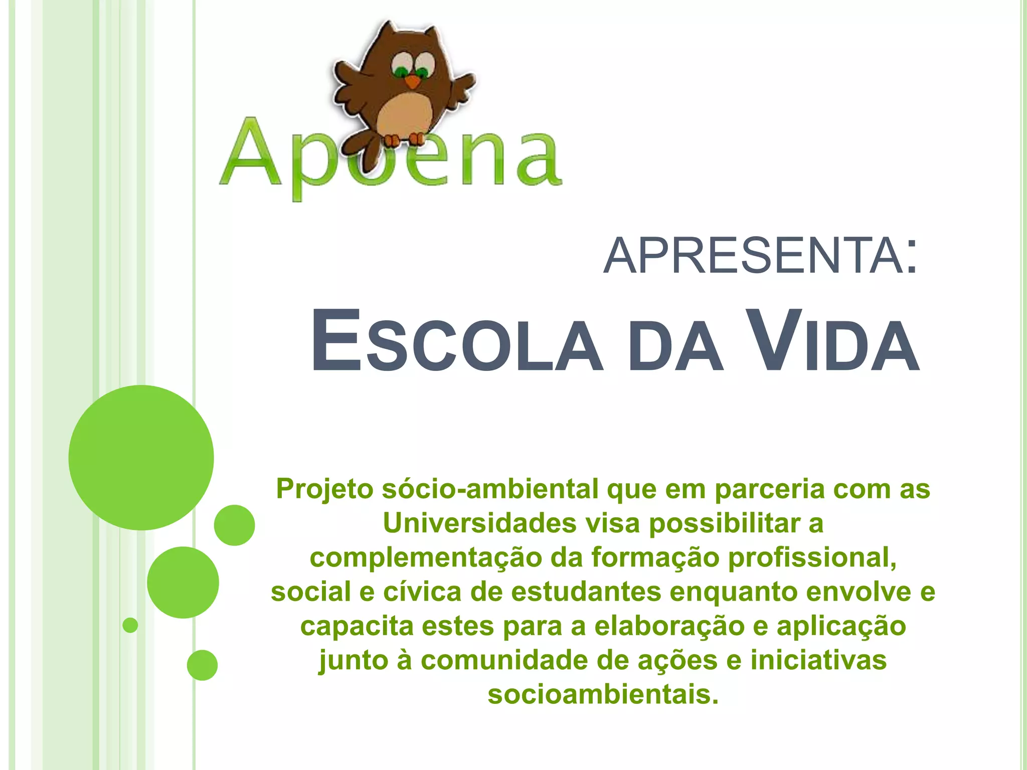 O projeto Escola da Vida visa promover a formação profissional, social e cívica de estudantes universitários por meio de ações socioambientais em seis áreas: educação, urbanismo/paisagem, economia, direito, saúde e produção artística/cultural. O projeto já conta com 20 voluntários e tem o potencial de ser replicado em outras universidades.