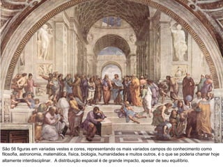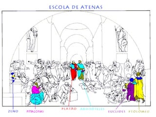 A pintura "Escola de Atenas" de Rafael representa filósofos de diferentes épocas históricas reunidos em torno de Platão e Aristóteles, ilustrando a continuidade do pensamento filosófico. As figuras centrais seguram livros que expõem suas filosofias opostas: Platão a teoria das formas e Aristóteles a realidade material. A obra também simboliza a busca do conhecimento pelo pensamento abstrato e pela investigação empírica da natureza.