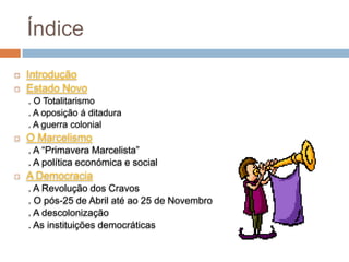 O documento descreve o período entre o Estado Novo, regime autoritário de Salazar, e a democracia portuguesa após a Revolução dos Cravos de 1974, incluindo o breve período de abertura política do governo de Marcelo Caetano e a luta pela independência das colônias africanas.