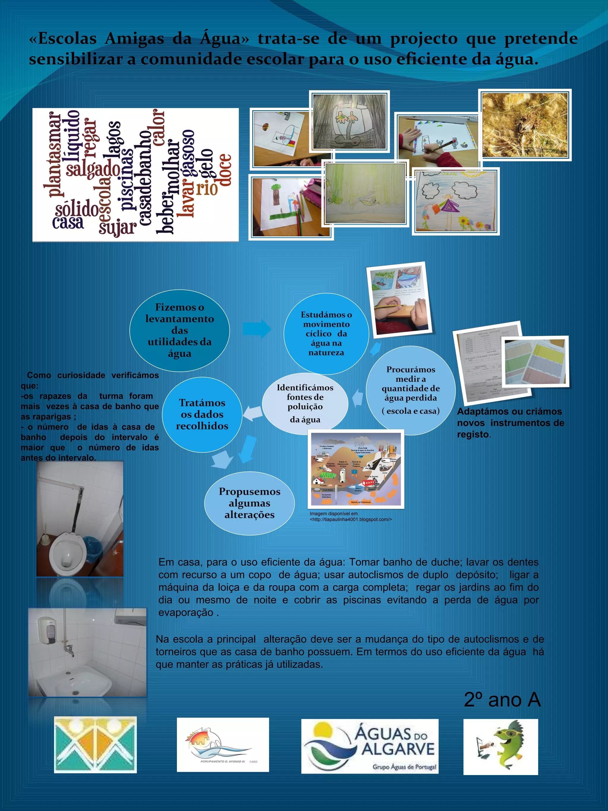 Este documento descreve um projeto chamado "Escolas Amigas da Água" que tem como objetivo sensibilizar a comunidade escolar sobre o uso eficiente da água. Ele fornece exemplos de como usar água de forma eficiente em casa, como tomar banhos mais curtos e lavar roupas e louça apenas com cargas completas. Na escola, o foco é trocar torneiras e autoclismos por modelos que gastam menos água.