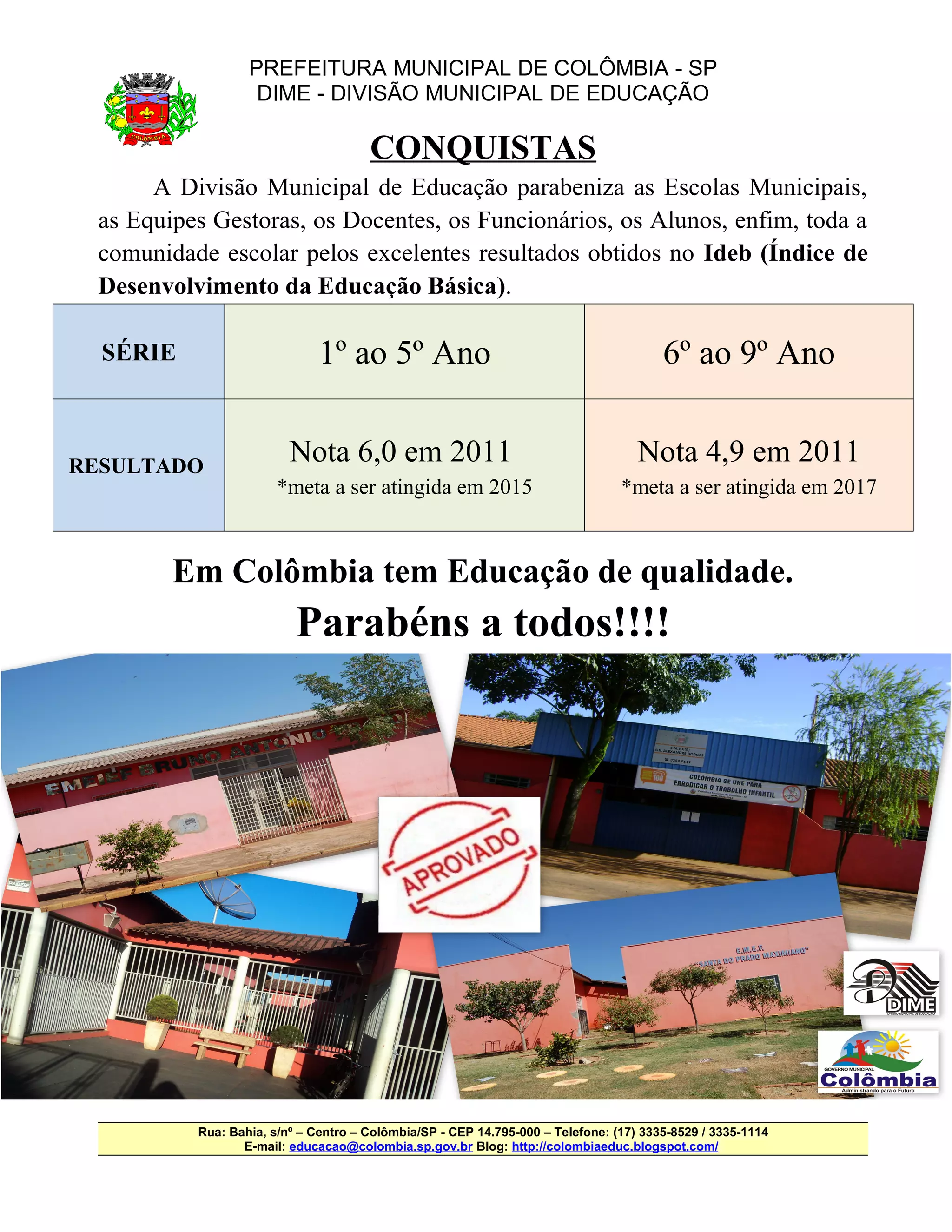 A Divisão Municipal de Educação de Colômbia parabeniza as escolas municipais por excelentes resultados no Ideb, com nota 6.0 no 1o ao 5o ano e 4.9 no 6o ao 9o ano, superando as metas para 2015 e 2017. A educação em Colômbia tem qualidade, graças ao trabalho de gestores, professores, funcionários e alunos.