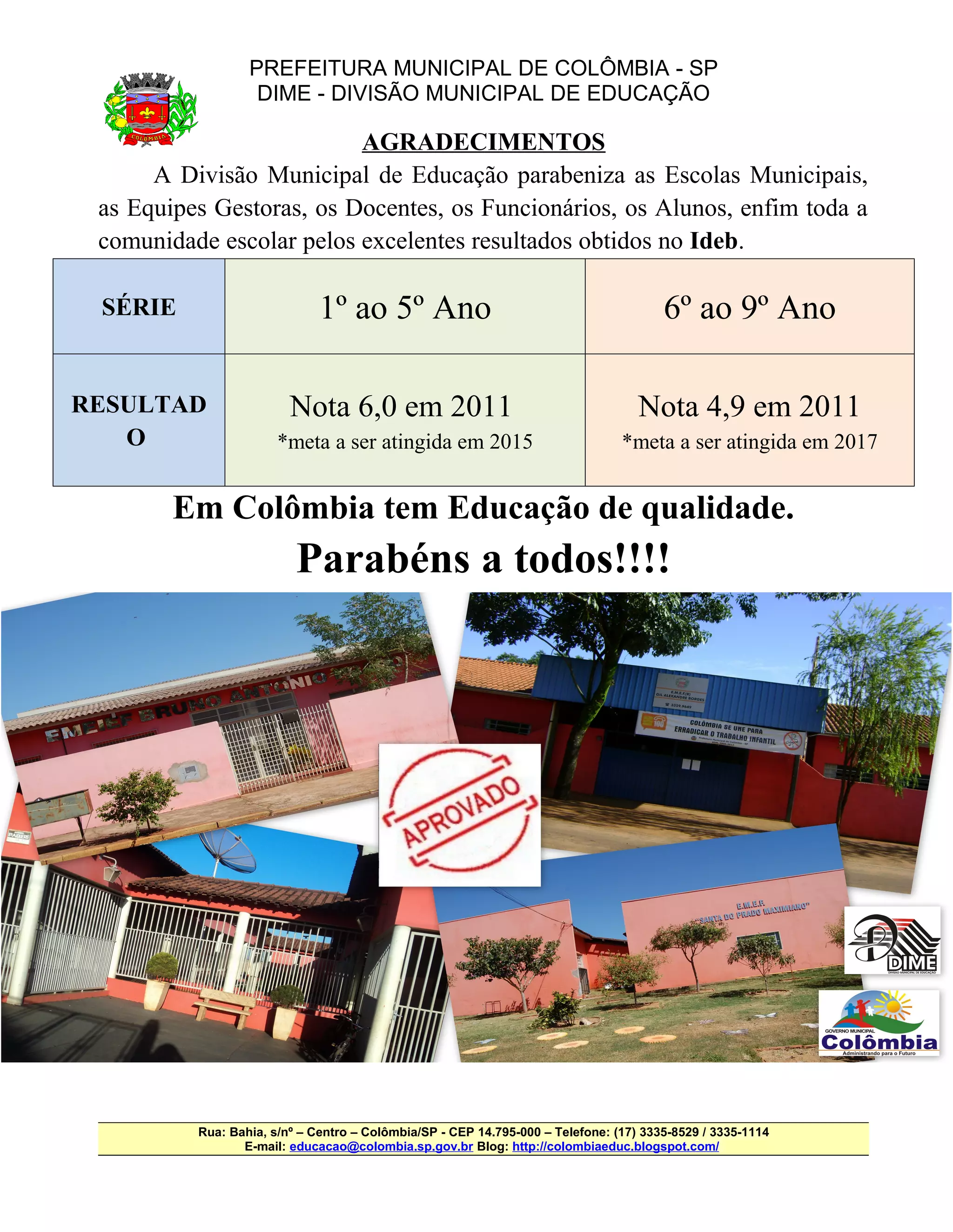 A Divisão Municipal de Educação de Colômbia parabeniza as escolas municipais e a comunidade escolar pelos excelentes resultados obtidos no Ideb, com nota 6,0 no 1o ao 5o ano e nota 4,9 no 6o ao 9o ano, ultrapassando as metas previstas para 2015 e 2017, respectivamente. A educação de qualidade em Colômbia é destacada.