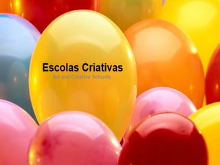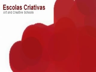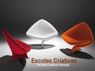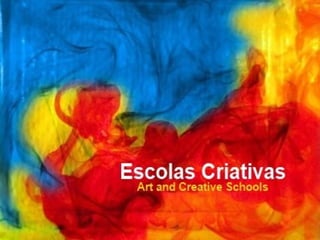 O projeto Escolas Criativas tem como objetivo desenvolver processos e atitudes criativas nas escolas através de atividades integradas. É organizado em três eixos: formação para professores, apoio a projetos criativos e criação de redes de colaboração. Qualquer escola pode participar mediante manifestação de interesse e diagnóstico inicial.