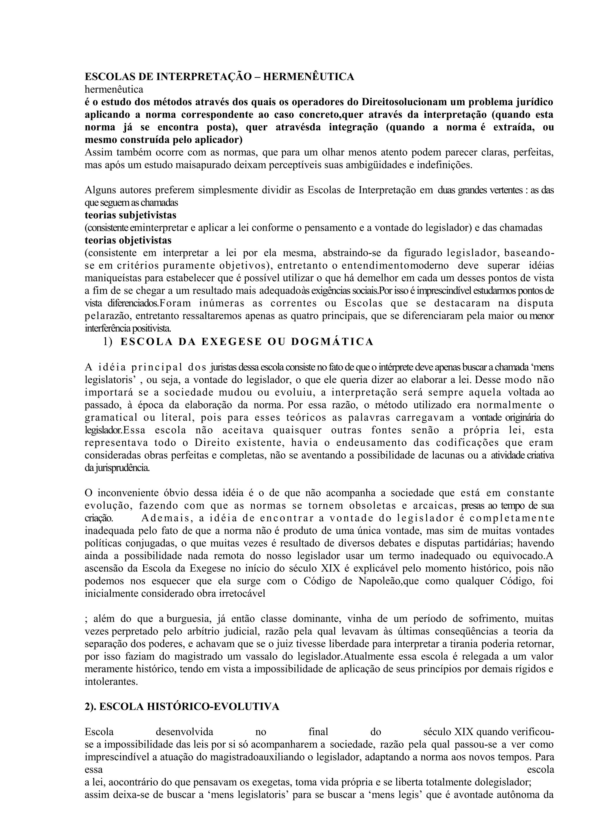 1) O documento discute diferentes escolas de hermenêutica jurídica e suas abordagens à interpretação legal.