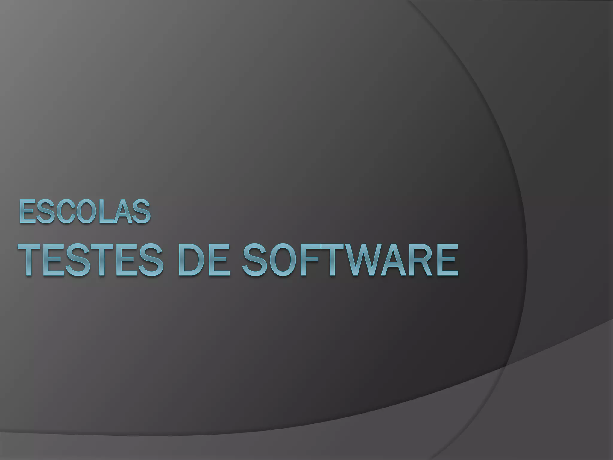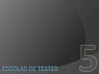 O documento apresenta as principais escolas de testes de software, comparando suas crenças, técnicas e implicações. São descritas a Escola Analítica, focada em técnicas rigorosas; a Escola Convencional, com ênfase em padrões e processos; a Escola da Qualidade, priorizando a garantia da qualidade; e a Escola Contextual, valorizando o contexto do projeto. Por fim, a Escola Ágil usa testes para validar histórias de usuário automatizadas. Cada escola tem seu valor quando aplicada