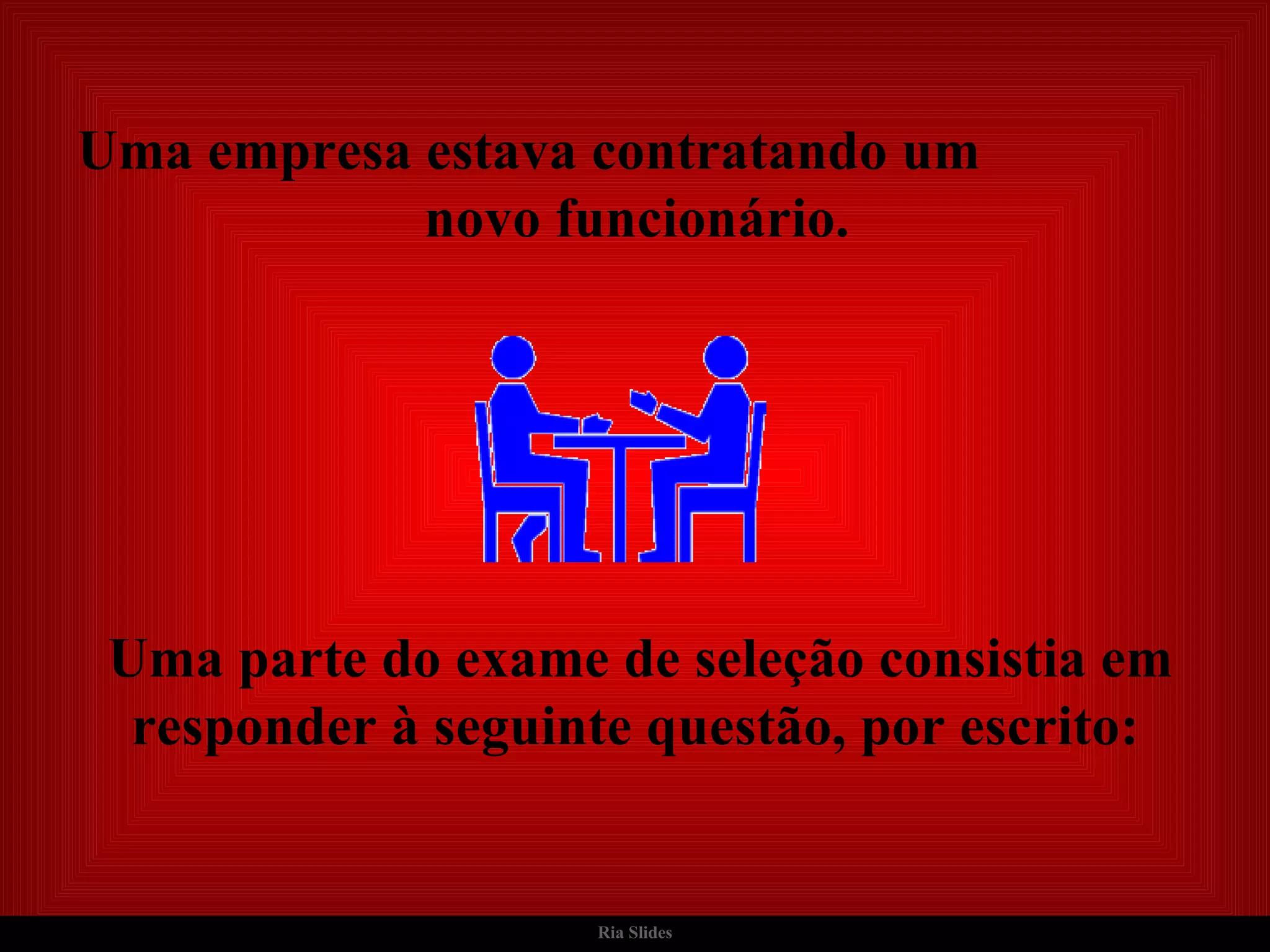 Uma empresa realizou um teste de seleção com candidatos que envolvia responder como lidariam em uma situação hipotética de emergência em que só poderiam salvar uma pessoa. Um candidato se destacou por sua resposta simples e solidária: daria as chaves do carro para o médico levar a senhora doente para o hospital, ficando para esperar o ônibus com a mulher amada.