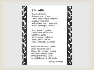 O documento resume os principais aspectos da escravidão no Brasil, incluindo a travessia forçada da África para o Brasil em condições precárias, a venda de escravos como mercadoria, o trabalho forçado de escravos em diversas atividades, as punições severas, a resistência incluindo quilombos e capoeira, e o processo de abolição no final do século 19.