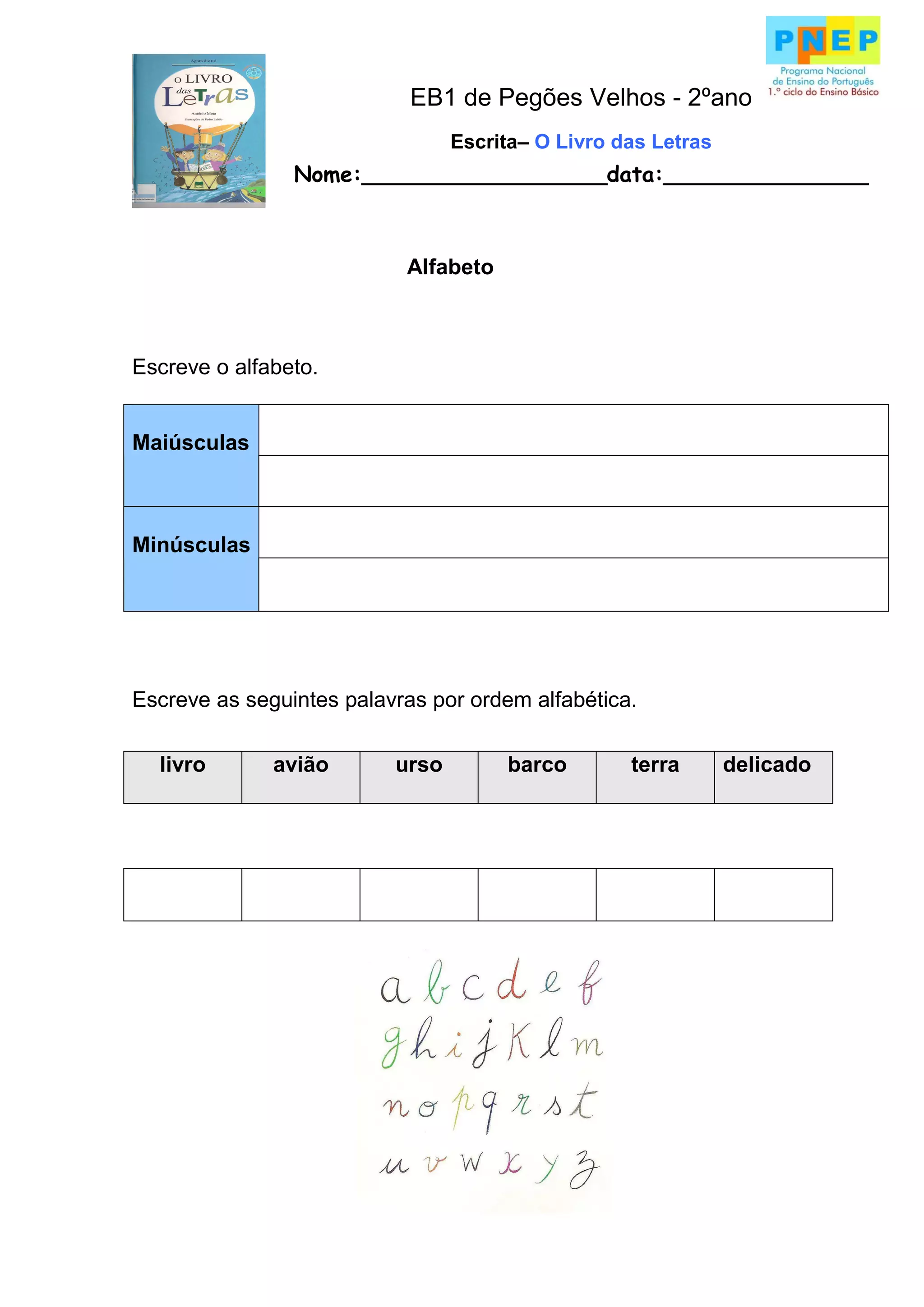 Este documento fornece instruções para um aluno completar uma atividade de escrita sobre o alfabeto e palavras. Ele inclui: 1) escrever o alfabeto maiúsculo e minúsculo; 2) escrever palavras por ordem alfabética; e 3) completar palavras com letras faltantes para formar novas palavras.