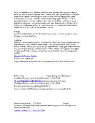A sequência didática propõe uma escrita coletiva de uma carta na EJA em 5 aulas. Os objetivos são produzir uma carta coletivamente e observar as diferenças entre linguagem oral e escrita. A carta será baseada na letra da música "Valsinha" e os alunos assumirão o papel da mulher da canção escrevendo para sua prima.