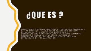 Este documento descreve a abordagem estruturalista da administração. Analisa as organizações considerando quatro elementos: autoridade, comunicação, estrutura de comportamento e estrutura de formalização. Também discute os principais expoentes desta corrente como Max Weber e identifica os aspectos analisados como padrões de interação, estratificação social e funções dos membros da organização.