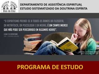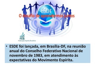 O documento apresenta o programa de estudos sistematizados da Doutrina Espírita (ESDE), dividido em nove módulos que abordam temas como a codificação espírita, a existência de Deus e do espírito, a reencarnação, a pluralidade dos mundos habitados e as leis divinas. O objetivo do programa é promover o estudo metódico e contínuo do Espiritismo baseado nas obras de Allan Kardec.