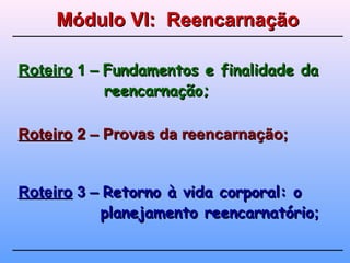 O documento discute as finalidades e fundamentos da doutrina da reencarnação segundo a Doutrina Espírita. Os principais pontos abordados são: 1) A reencarnação possibilita a reparação, aprendizagem e elevação dos espíritos através de diversas existências; 2) A relação de causa e efeito no processo reencarnatório manifesta a justiça divina; 3) As diferentes existências dos espíritos são sempre progressivas, não regressivas.