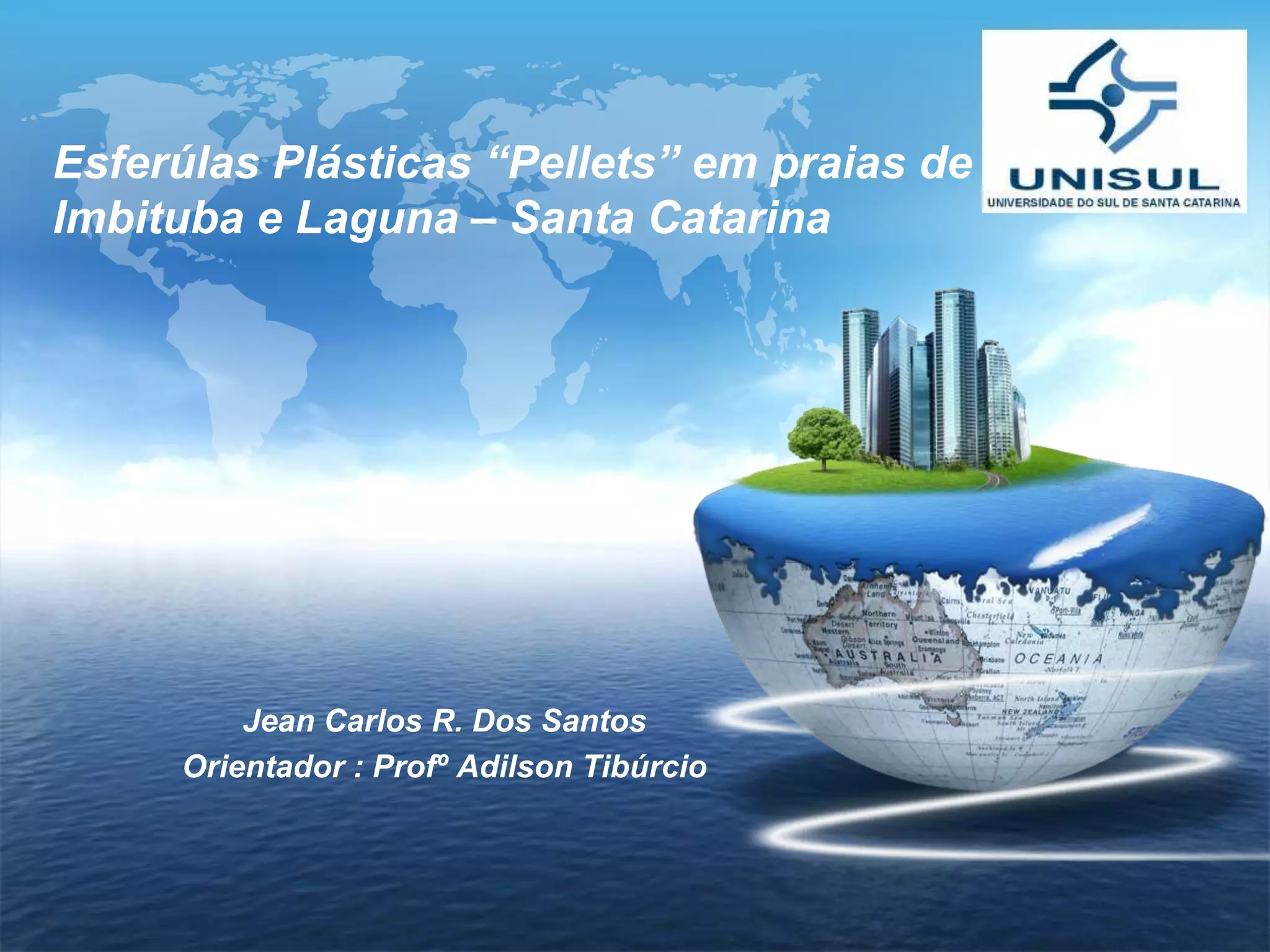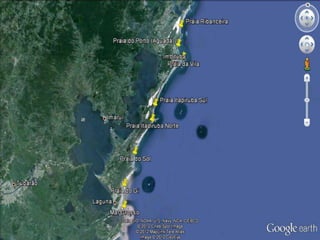 O documento descreve uma pesquisa sobre a presença de esferulas plásticas em praias de Imbituba e Laguna, Santa Catarina. Foram amostradas 8 praias e a praia do Gi apresentou a maior concentração de esferulas, com uma média de 81,25 itens/m2. A praia de Itapirubá Sul teve a segunda maior concentração. As esferulas foram classificadas por cor e peso. A praia do Porto apresentou maior quantidade de esferulas brancas, possivelmente devido à proximidade com o porto de I