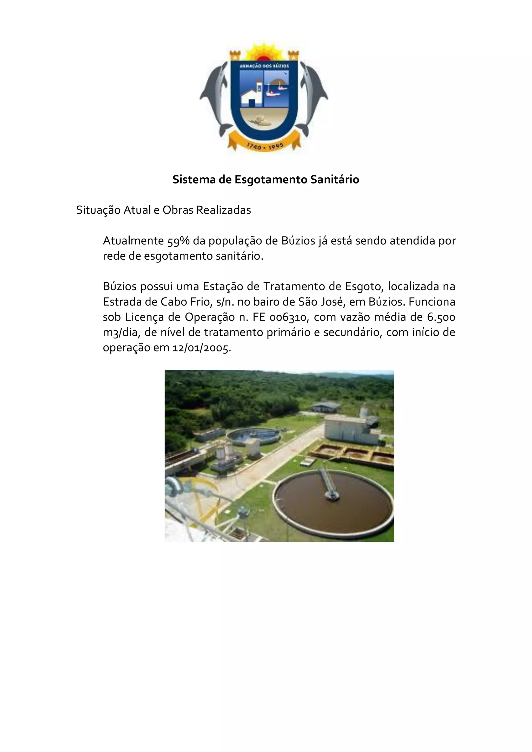 O documento descreve o sistema de esgotamento sanitário de Búzios, no Rio de Janeiro. Atualmente, 59% da população é atendida por rede de esgoto e existe uma estação de tratamento. Nos últimos anos, a prefeitura realizou diversas obras para expandir a rede e impedir o despejo de esgoto nas praias e lagoas.