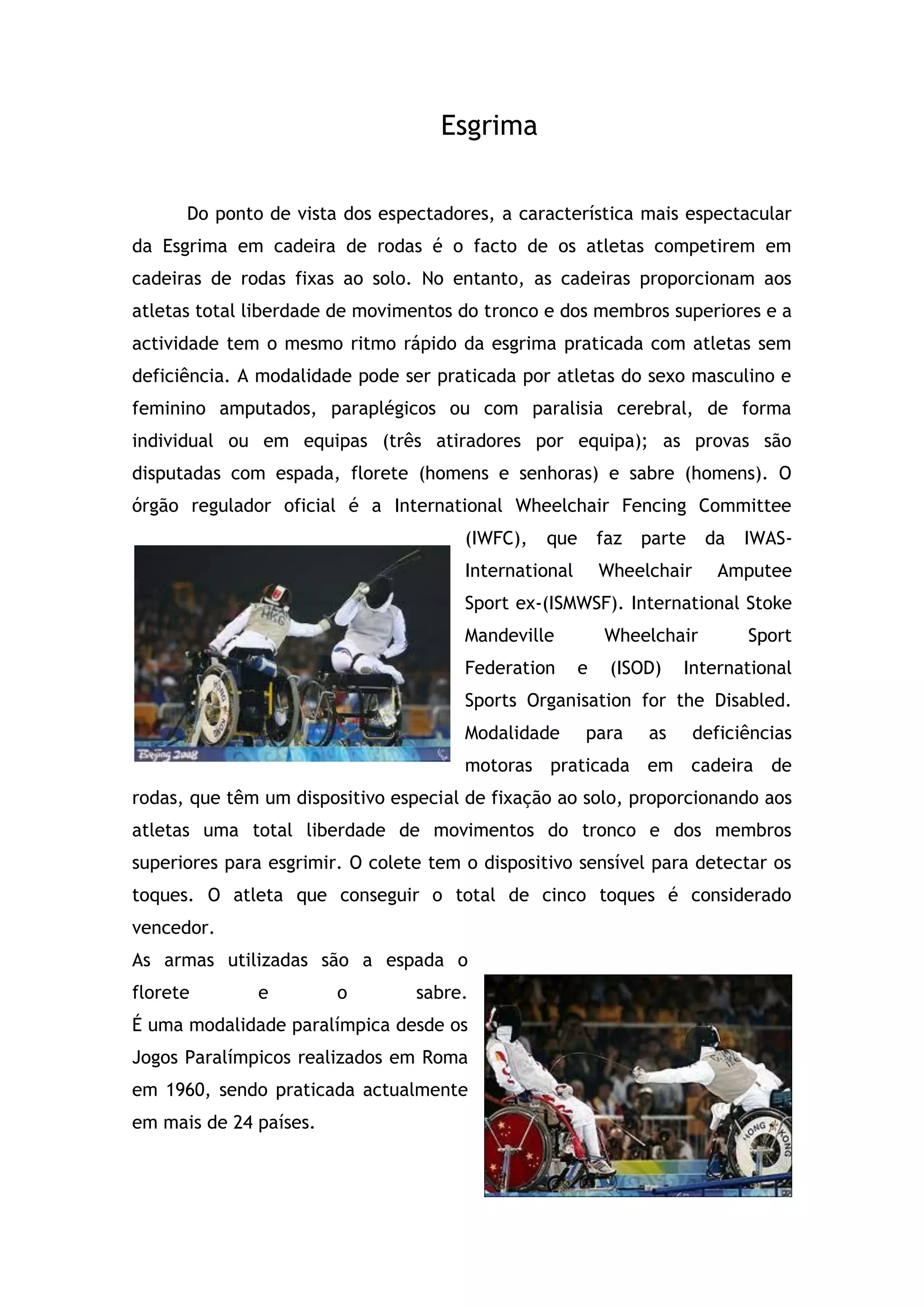 A esgrima em cadeira de rodas é uma modalidade paralímpica praticada desde 1960 onde atletas com deficiências motoras competem em cadeiras fixas ao solo, proporcionando total mobilidade dos membros superiores. As provas são disputadas com espada, florete e sabre de forma individual ou em equipas. O vencedor é aquele que conseguir um total de cinco toques no colete sensível do adversário.