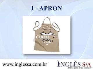 O documento lista termos em inglês relacionados a itens de cozinha, sala de jantar, banheiro e banho, como avental, tapete de cozinha, guardanapo, toalha de banho e jogo de toalhas. Fornece também links para o site www.inglessa.com.br com mais informações sobre cada termo.