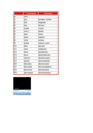O documento ensina sobre números cardinais e ordinais em espanhol, incluindo como escrever os anos de 1500 a 2025. Ele instrui que os números de 20 a 29 nunca se separam em espanhol e fornece exemplos de como escrever datas completas em espanhol.