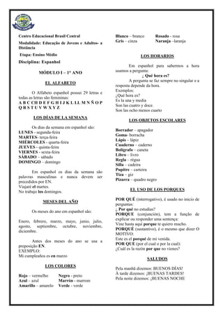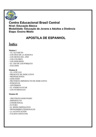 O documento apresenta um resumo de três módulos de uma apostila de espanhol para o ensino médio a distância. O Módulo I aborda tópicos básicos como o alfabeto, dias da semana, meses do ano, cores e horários. O Módulo II discute temas como artigos, verbos no presente, preposições e adjetivos possessivos. O Módulo III trata de tempos verbais como pretérito perfeito, imperfeito e condicional, além de modo imperativo e pronomes.