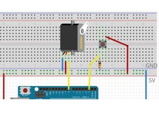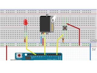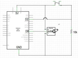 O documento discute o uso de servo motores no Arduíno para controlar movimento através de circuitos simples, incluindo um que simula uma cancela controlada por botão que abre e fecha após um tempo, com um LED indicando o estado.