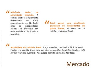 “Brasil possui umasignificante população de descendentes de países árabes. Há cerca de 15 milhões em todo o Brasil.“Influência árabe na alimentação brasileira. A comida árabe é amplamente disseminada no Brasil, especialmente em São Paulo onde as especialidades árabes são oferecidas em uma variedade de locais e formatos.“Atratividade da culinária árabe. Preço acessível, saudável e fácil de servir | Flexível – a comida árabe cabe em diversas ocasiões (refeições, lanches, coffebreaks, reuniões, eventos) | Adequação perfeita ao modelo fast-food.Mercado