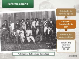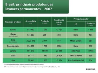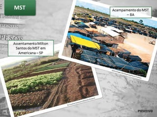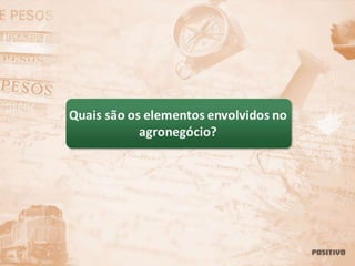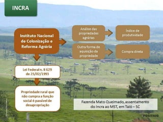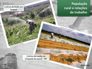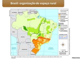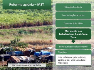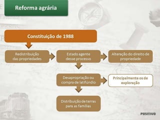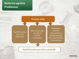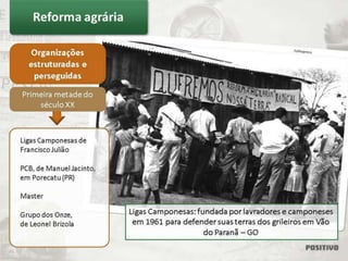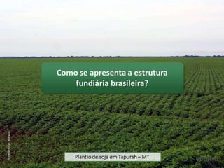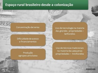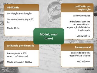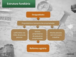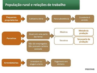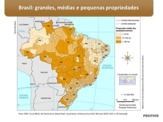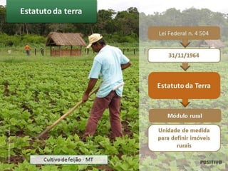 #2 Objetivos que deverão ser atingidos com o estudo da unidade:Compreender as ações políticas praticadas pelo governo brasileiro para o espaço rural. Compreender a proposta do Estatuto da Terra. Conhecer a estrutura da proposta de reforma agrária no Brasil.Conceituar agronegócios.Compreender a relação de trabalho da população rural.A escala dos mapas que estão sendo apresentados nos slides foi calculada para a versão impressa do livro didático, segundo um tamanho predefinido. Quando o mapa é projetado em meio digital, não há como recalcular e ajustar essa proporção automaticamente. Assim, explicar aos alunos que, conforme o tamanho da tela utilizada na projeção, a escala gráfica poderá estar com mais ou com menos um centímetro de intervalo, o que não é o correto. Os alunos poderão visualizar o mapa no livro didático para que tenham noção da escala utilizada.