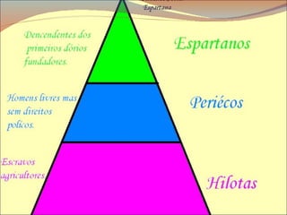 A sociedade espartana era dividida em três grupos sociais e valorizava o militarismo. Os homens passavam por um rigoroso treinamento militar desde crianças, incluindo ficar sem roupas para desenvolver resistência e roubar comida arriscando a própria vida. O objetivo era prepará-los para se tornarem soldados habilidosos e leais a Esparta.
