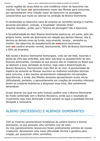Este documento descreve as principais espécies de canários brancos, incluindo: 1) Branco recessivo, que requer duas cópias do gene para ser expresso e tem a pele cor de rosa; 2) Branco dominante, que não é totalmente branco e tem resíduos amarelos nas penas; e 3) Albino recessivo e dominante, que têm olhos vermelhos e são mais difíceis de criar.
