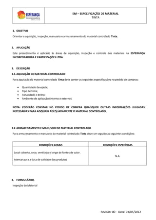 Este documento fornece diretrizes para a aquisição, inspeção, armazenamento e manuseio do material controlado tinta, incluindo especificações para pedidos de compra de tinta e condições para o armazenamento como em local coberto e seco longe de fontes de calor.