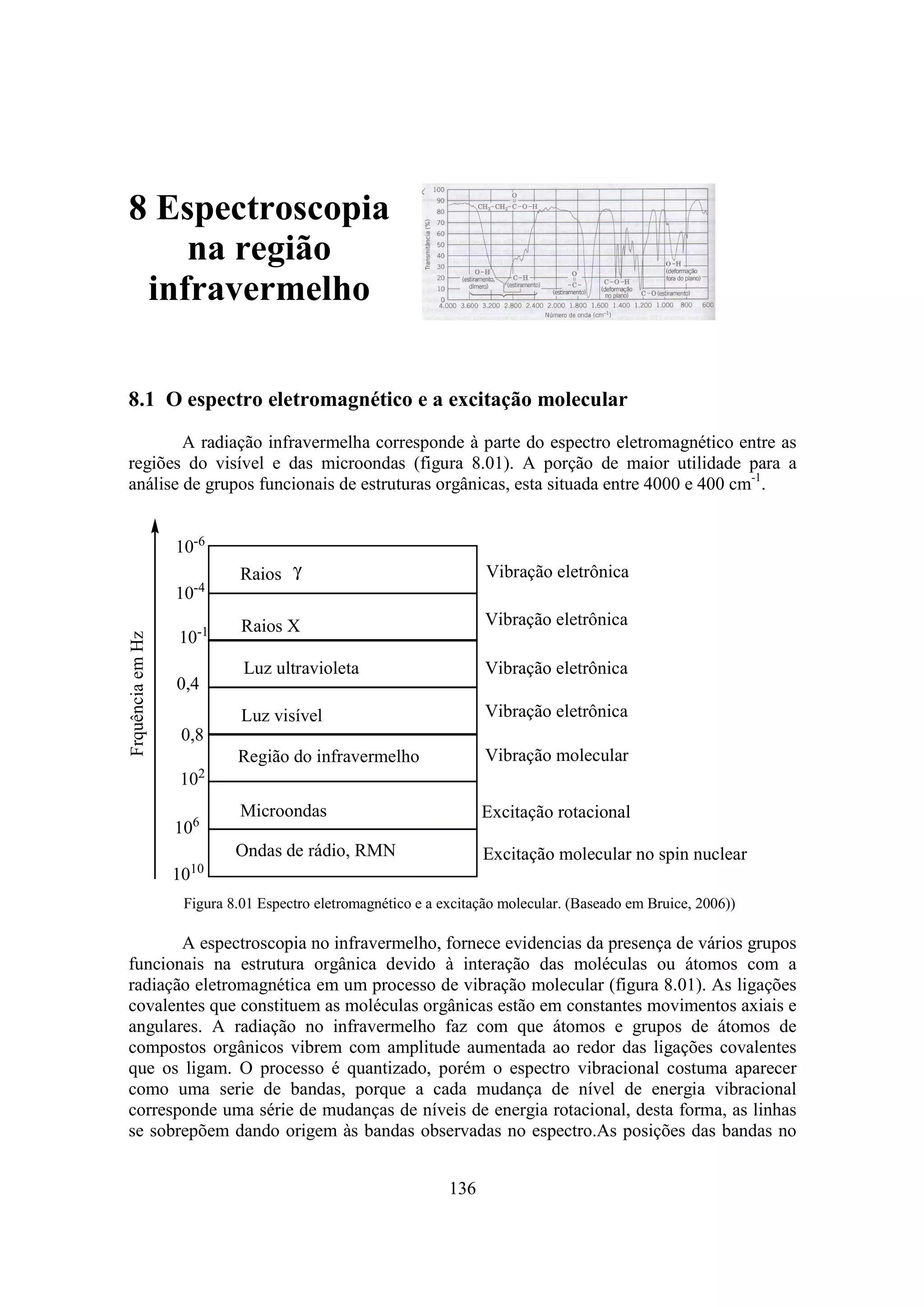 O documento discute espectroscopia no infravermelho, explicando que analisa vibrações moleculares em amostras orgânicas para identificar grupos funcionais. A radiação no infravermelho causa vibrações em ligações químicas em níveis de energia específicos, gerando picos de absorção. O espectrômetro FTIR mede esta absorção para mapear a presença de grupos como C=O, C-O, C-H, revelando detalhes estruturais.