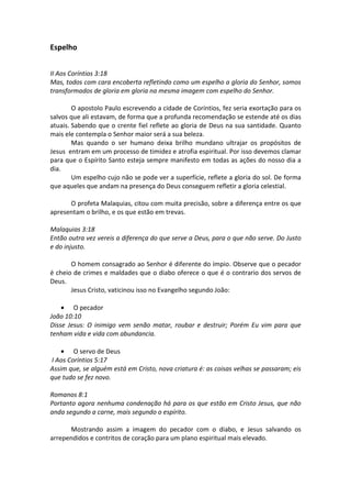 O documento discute como os cristãos refletem a glória de Deus e como isso os transforma. Também contrasta como os pecadores refletem as obras de Satanás versus como os servos de Deus refletem a nova criatura em Cristo. Finalmente, discute como um dia veremos a Deus face a face sem nenhuma distorção.