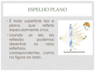 O documento discute as propriedades dos espelhos planos, incluindo que as imagens formadas são virtuais, do mesmo tamanho do objeto e simétricas em relação ao espelho, com a distância objeto-espelho igual à distância imagem-espelho.