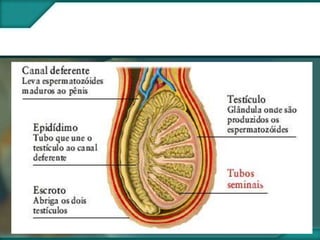 O documento descreve o processo de espermatogênese em homens, que envolve a produção de espermatozoides nas células germinativas precursoras nas tubos seminíferos e sua maturação no epidídimo. A espermatogênese inclui fases de crescimento, diferenciação e espermiogênese, controlada pelo eixo hipotálamo-hipófise-testículos. Fatores como hormônios, temperatura e toxinas podem interferir no processo.