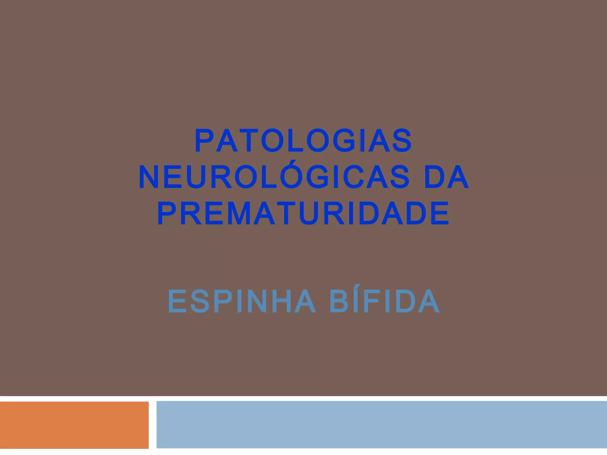 Este documento discute patologias neurológicas da prematuridade, incluindo espinha bífida e hidrocefalia. A espinha bífida ocorre quando há uma falha no fechamento do tubo neural durante o desenvolvimento fetal, levando a anormalidades na coluna vertebral e medula espinhal. A hidrocefalia é o acúmulo excessivo de líquor cerebral dentro dos ventrículos ou espaço subaracnóideo, geralmente associado a dilatação ventricular e aumento da pressão intracraniana. O documento