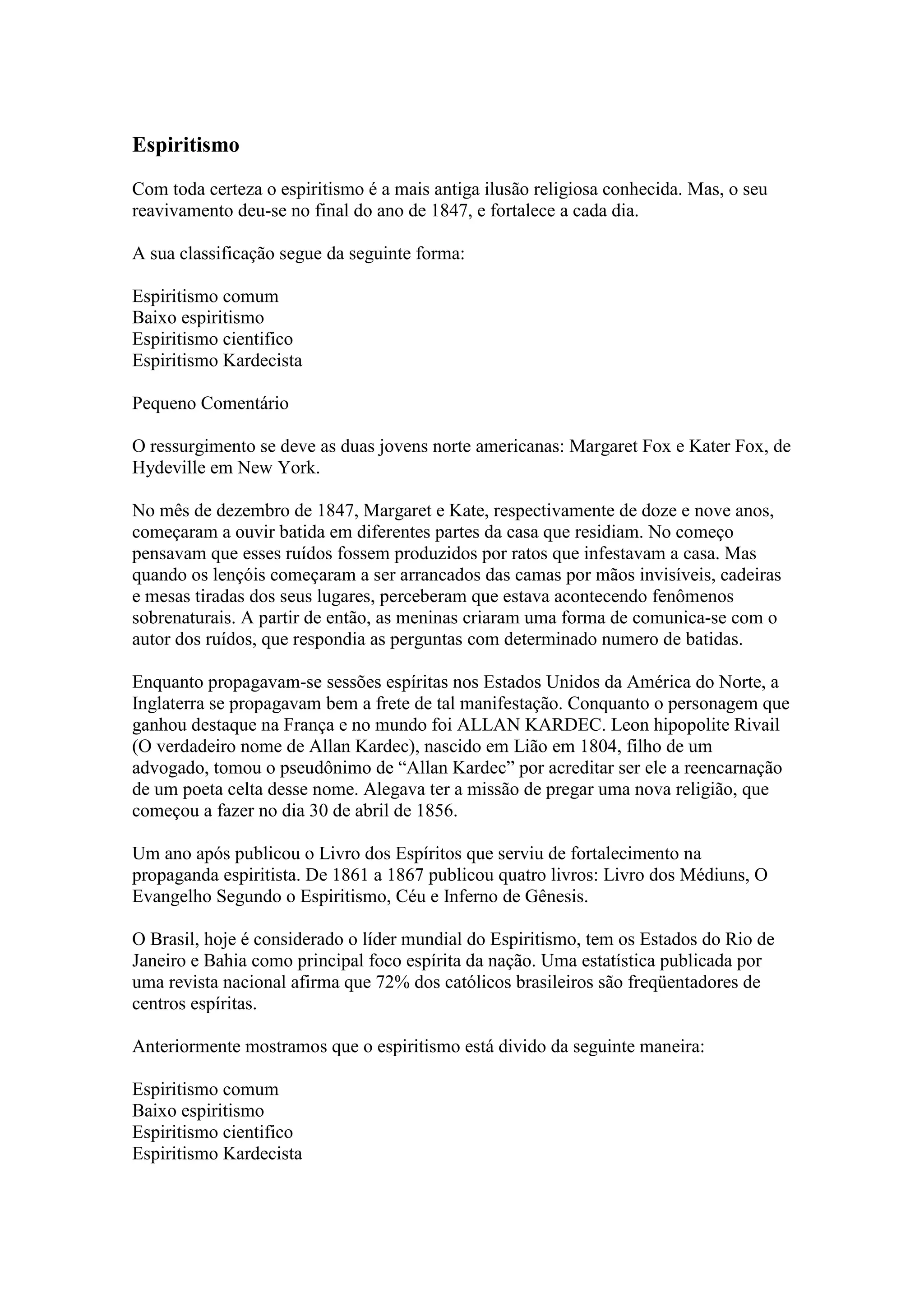 O espiritismo surgiu nos Estados Unidos no século XIX através de duas irmãs que ouviam batidas misteriosas. Allan Kardec popularizou o espiritismo na França com seus livros, propagando crenças como reencarnação e comunicação com espíritos. Hoje o Brasil tem o maior número de adeptos do espiritismo kardecista, que diverge dos ensinamentos bíblicos sobre a vida após a morte e a salvação pela fé em Cristo.