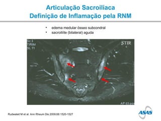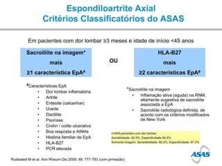 O documento discute espondiloartrites, um grupo de desordens inflamatórias que afetam principalmente a coluna vertebral. Apresenta os conceitos, epidemiologia, manifestações clínicas e radiológicas de condições como espondiloartrite indiferenciada, espondilite anquilosante, síndrome de Reiter e artrite psoriática. Também discute a etiopatogenia, diagnóstico e tratamento destas condições musculoesqueléticas inflamatórias.