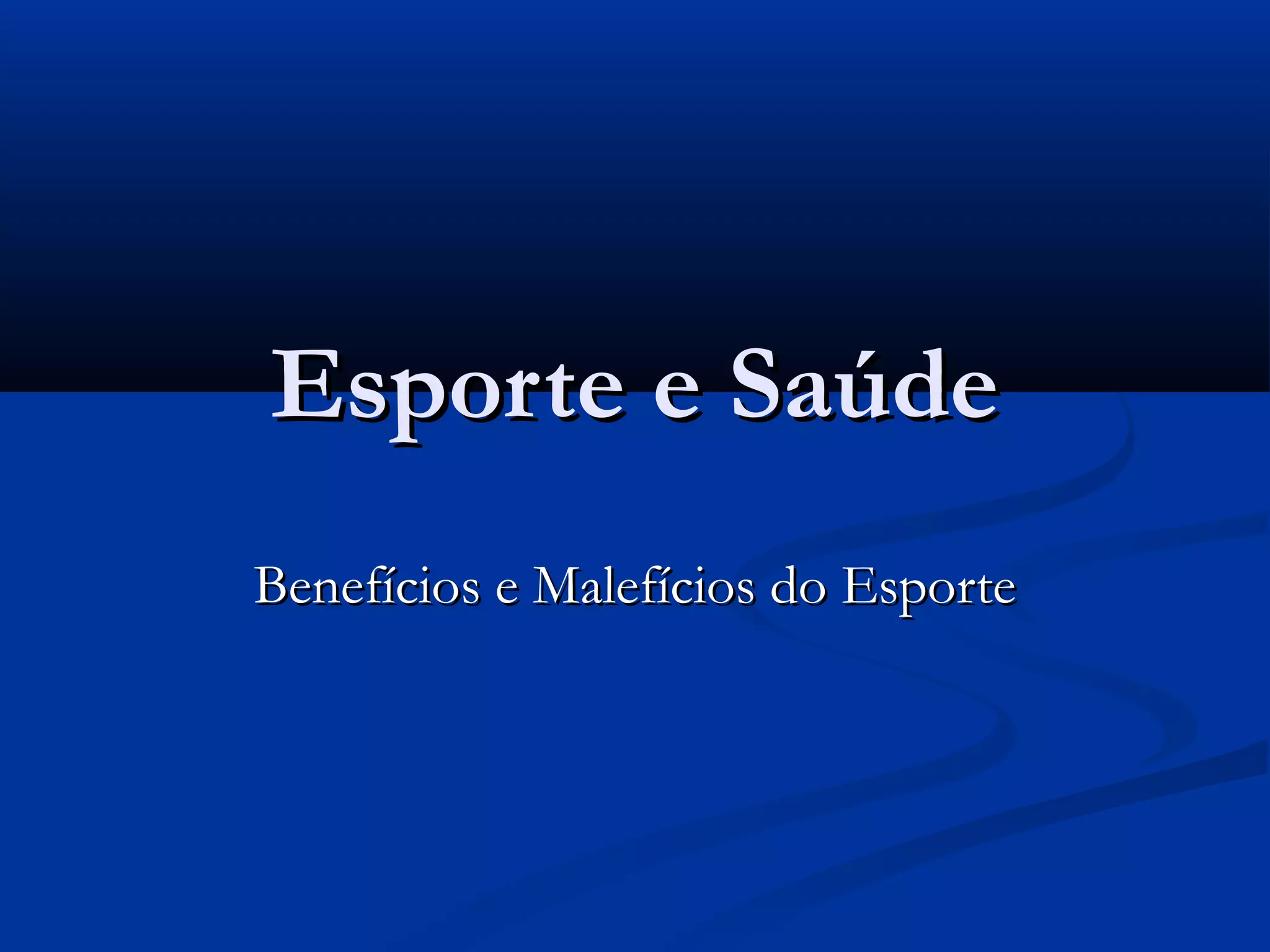 O documento discute os benefícios e malefícios do esporte. Entre os benefícios estão o condicionamento físico e a promoção da saúde. Os malefícios incluem lesões se praticado de forma incorreta e problemas de saúde associados ao uso de anabolizantes ou à falta de atividade física.